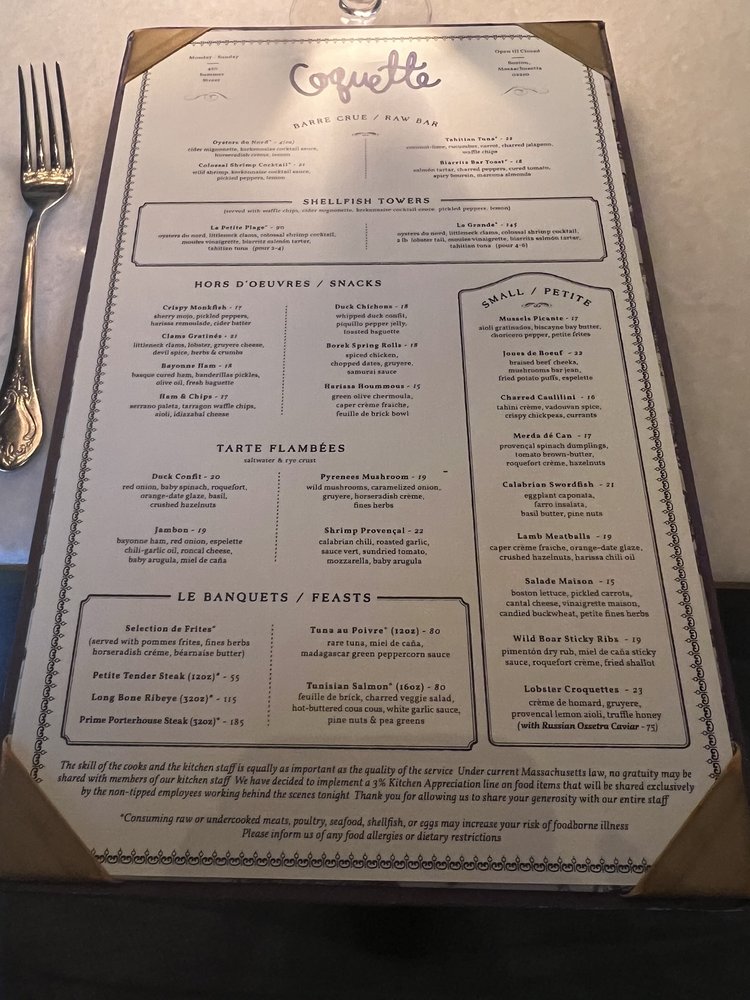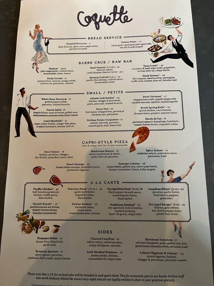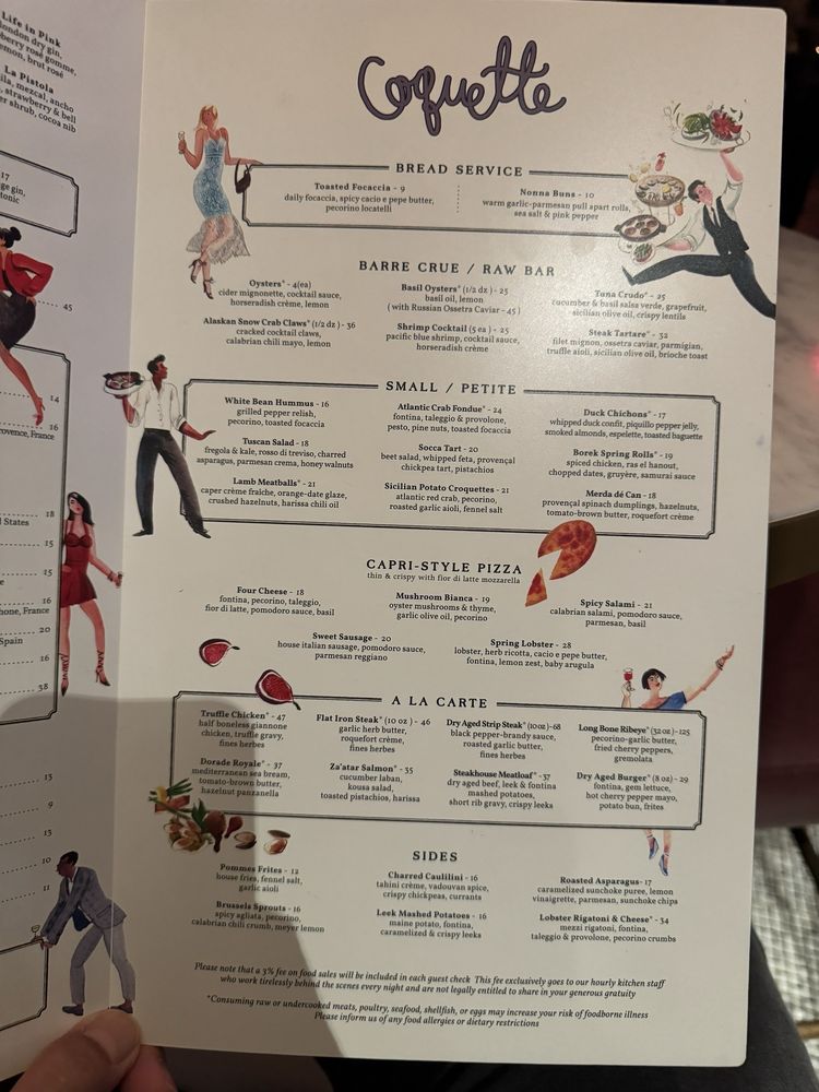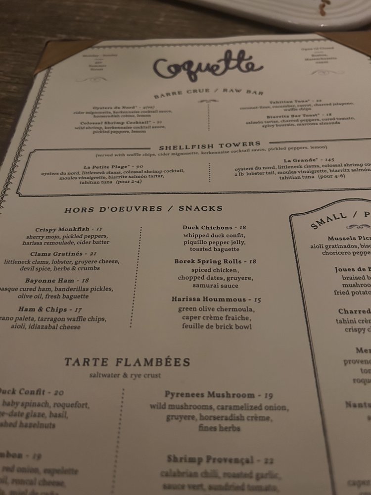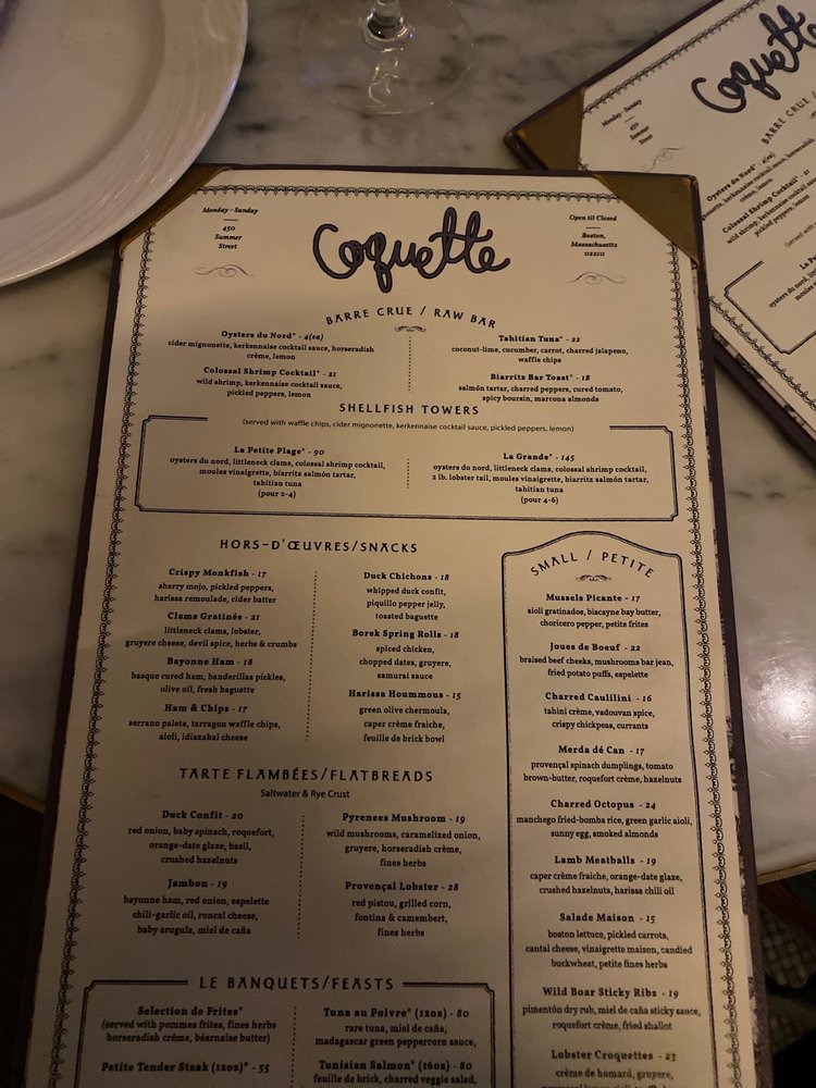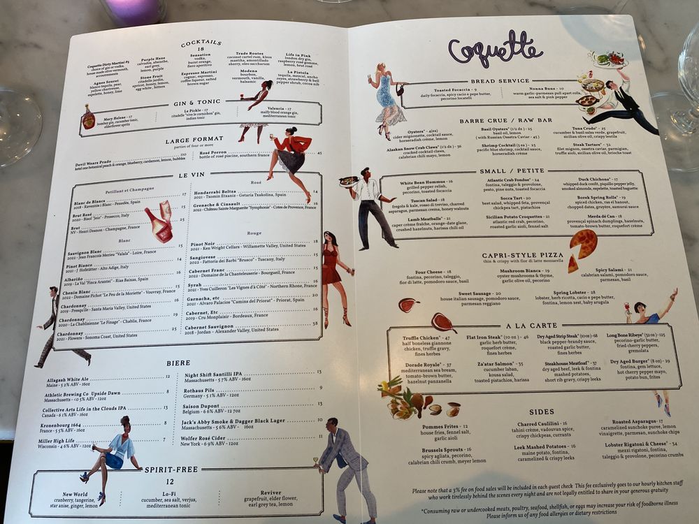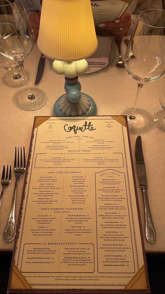 Introducing Coquette, a trendy and upscale pizza, cocktail bar, breakfast, and brunch spot located in Boston's Seaport area. With a vibrant and classy atmosphere, Coquette is a great choice for a date night or a casual gathering. The menu offers a variety of options with limited vegetarian choices. Customer reviews highlight dishes like the Atlantic Crab Fondue and the Toasted Focaccia, both receiving high ratings.